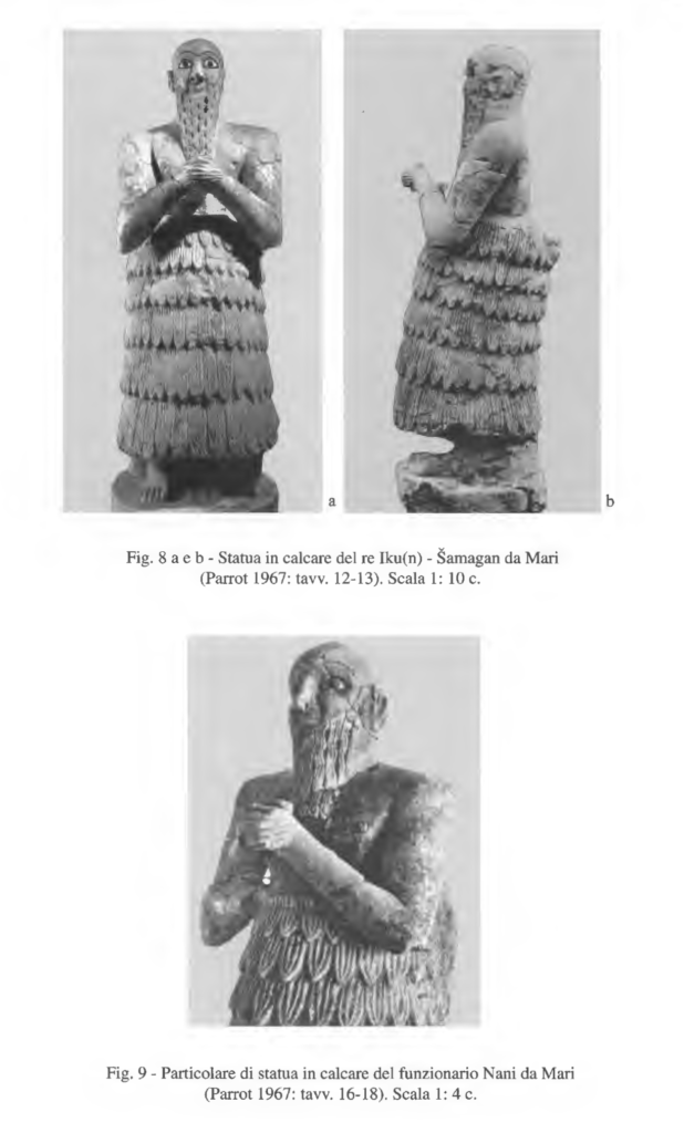 I caratteri appena richiamati, così come il trattamento della base, a nicchia, ricorrono infatti nella immagine del sovrano Entemena (Enmetena) di Lagas (Fig. 7) e nella statuaria della capitale sull’Eufrate, Mari, al tempo della Ville Il, di cui proponiamo qui a titolo esemplificativo il re Iku(n)-Samagan (Fig. 8) e soprattutto il funzionario Nani (Fig. 9) per la corrispondenza delle dimensioni.