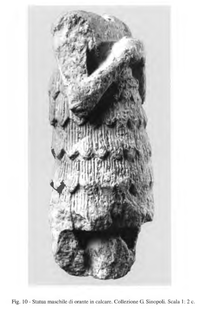 Ad uno di questi cittadini abbienti appartiene la statua maschile in calcare anepigrafe e priva della testa, nella postura dell’orante di fronte alla divinità [S. 20 (abbreviazione per Collezione Sinopoli n. 20); h. max. 34,5 cm; largh. (spalle) 15 cm; testa mancante di netto, scalfitture e mutilazioni sul torso e le braccia, fessurazioni diffuse. Collezione G Sinopoli. ] (Figg. 6, 10).